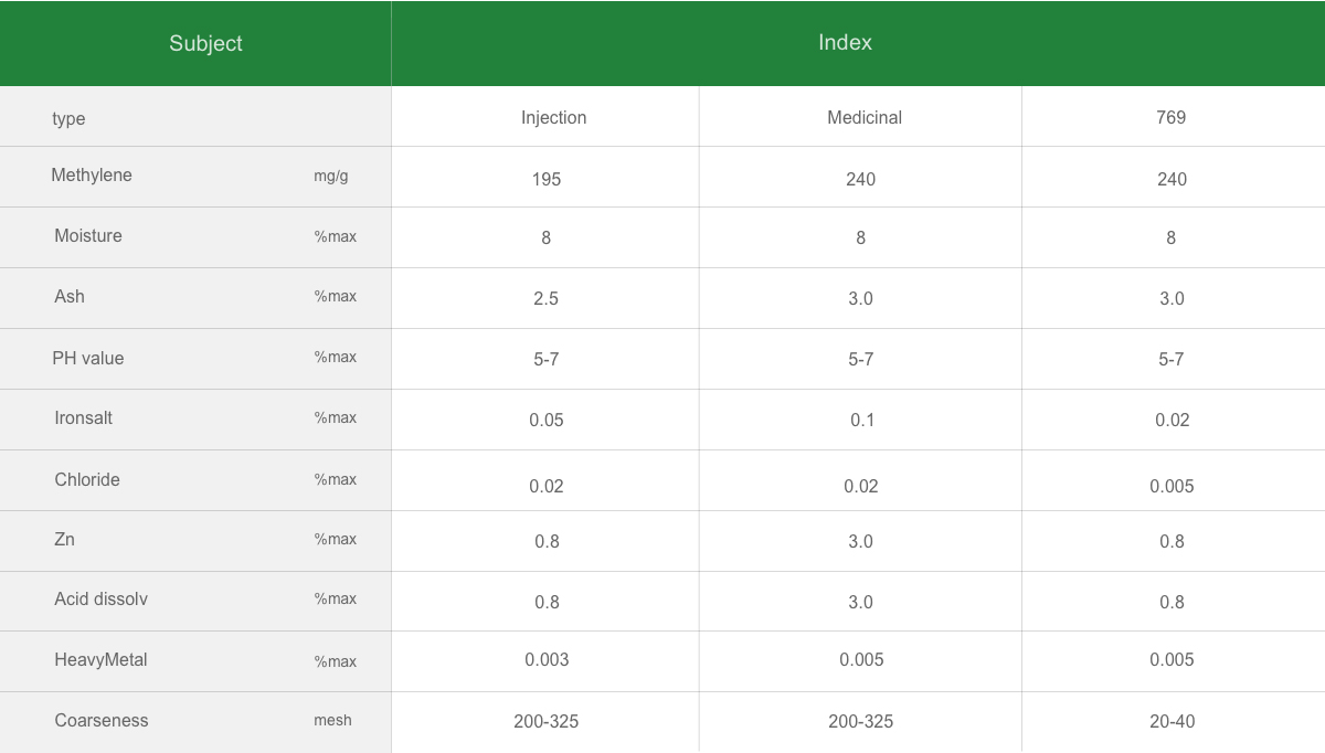 (pharmaceutical grade) woodiness powder activated carbon with high quality of sawdust as raw material by steam activation, through special production technology with physical method and chemical method of refined processing, grinding and become, has a large surface area, strong decoloring force, high purity, quick filtration speed, stable quality, etc., mainly used in: medicine, pesticides, Chinese and western reversed-phased decoloring and removing impurity refined, with absorption of intestinal bacteria and detoxification.