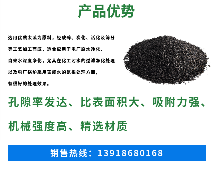 選用優(yōu)質(zhì)太溪為原料,經(jīng)破碎、炭化、活化及篩分等工藝加工而成,外觀呈黑色無(wú)規(guī)則顆粒,煤質(zhì)顆?;钚蕴繌?qiáng)度高、孔隙發(fā)達(dá)、比表面積大,尤其微孔容積大而獨(dú)具優(yōu)點(diǎn),適合應(yīng)用于電廠原水凈化、自來(lái)水深度凈化,尤其在化工污水的過(guò)濾凈化處理以及電廠鍋爐采用苦咸水的氯根處理方面,有很好的處理理效果。